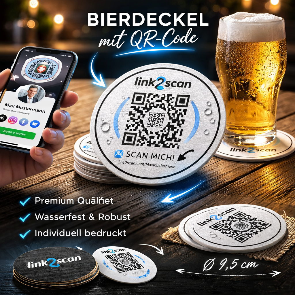 Mit dem link2scan QR-Bierdeckel verwandelst du jeden Tisch in eine digitale Visitenkarte.